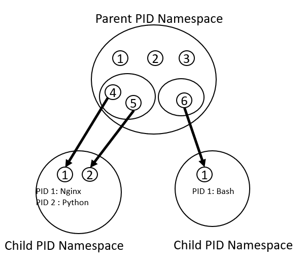 Parent Namespace는 Child namespace에 존재하는 Process에 접근 가능 하지만 Child namespace는 상위에 접근할 수 없고 Namespace가 분리된 이후에는 Child Namespace에선 상위에 무엇이 있는지조차 알 수 없다. 따라서 예를 들어 Linux Init프로세스를 container에서 실행시키면 상위에 무엇이 있는지도 모른 채 본인이 PID 1 Root 프로세스인 줄 알고 실행되게 된다.