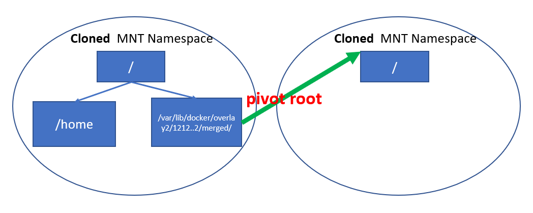 아래 예제에서 원래 Cloned MNT Namespace에 속한 프로세스가 pivot root로 root mount를 /var/lib/docker/overlay2/~~~~/merged/ 로 설정해 새로운 root로 옮긴걸 볼 수 있다.