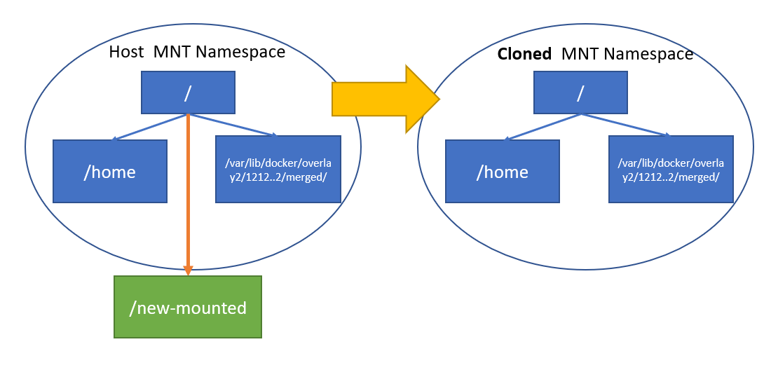 아래의 예를 보자. 아래 그림은 Host에서 container 생성을 위해 막 새로운 MNT Namespace를 만든 직후에서의 상황이다. 막 Clone된 MNT Namespace는 여전히 Parent MNT Namespace에서와 같이 Host root file system을 비롯해 모든 경로에 접근 가능하다. 다만 아래 그림과 같이 MNT Namespace가 분리된 직후 새로 mount 된 /new-mounted는 Child MNT Namespace에서 접근할 수 없다.