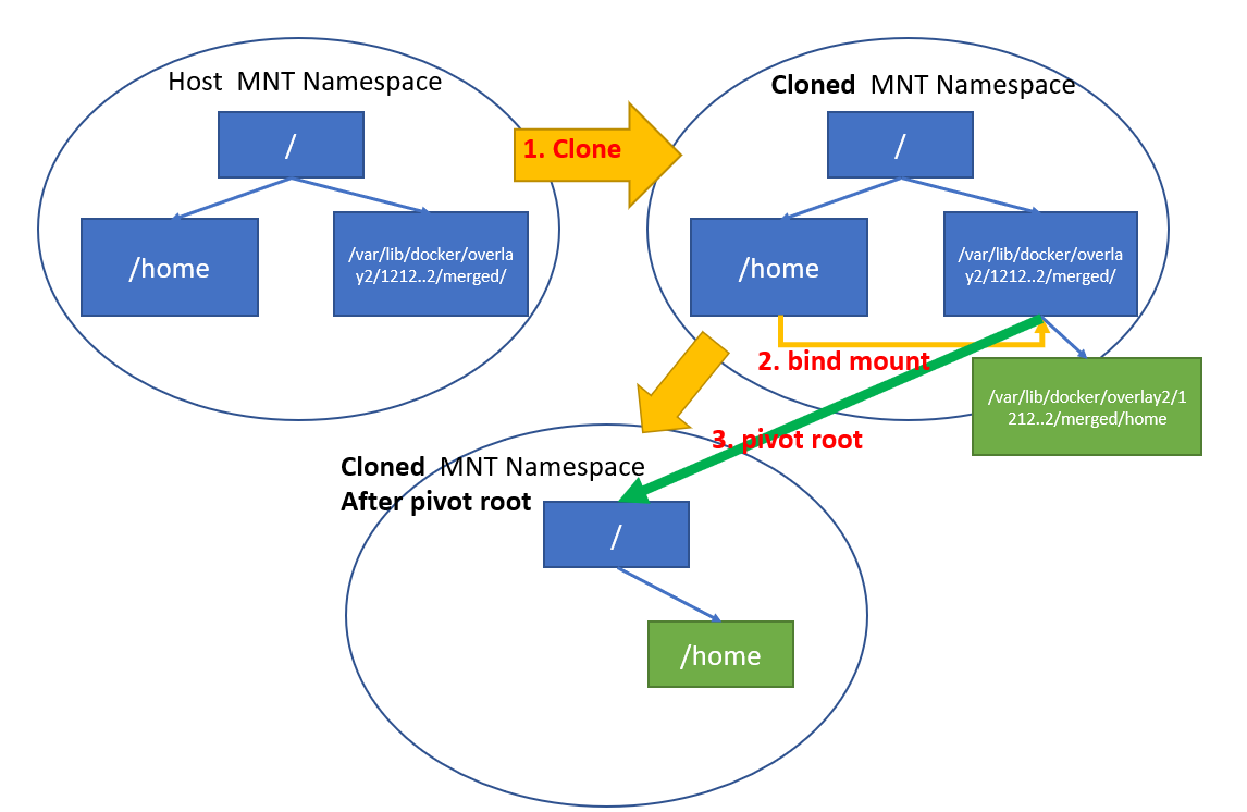 Docker가 container 실행 시 bind mount를 지원하지만, container가 실행되는 상태에서는 host로부터 container로의 mount를 허용하지 않는 건 MNT Namespace의 특성과 관련이 깊다. 한번 MNT Namespace가 분리된 이후에는 Host에서 아무리 container directory에 ( 예제 그림에서는 /var/lib/docker/overlay2/~~~~/merged/home ) 에 mount 해봤자 이는 Parent MNT Namespace에서 mount 한 것이므로 Child MNT Nmaespace에 있는 container는 해당 mount point를 볼 수 없다. 따라서 Docker가 bind mount를 행하려면 먼저 Child MNT Namespace를 Clone한 이후 pivot-root를 실행하기 전에 Child MNT Namespace에서 bind mount를 행해야 한다. 그 이후 pivot root를 하면 Host 의 directory를 bind mount한 container root file system이 완성된다.