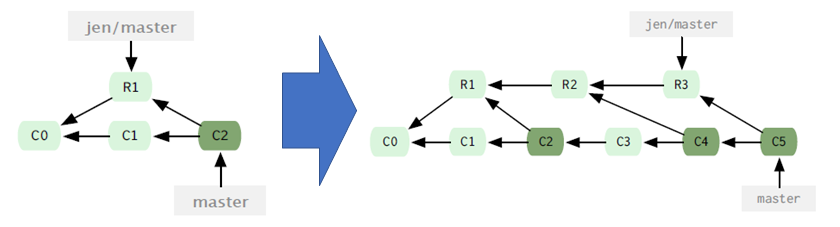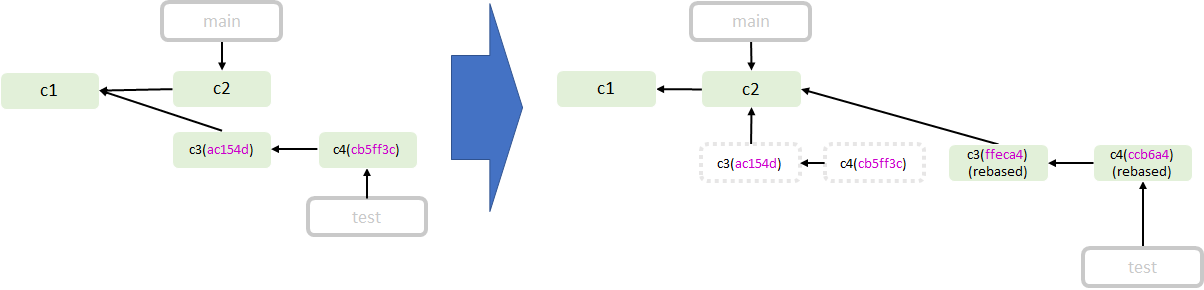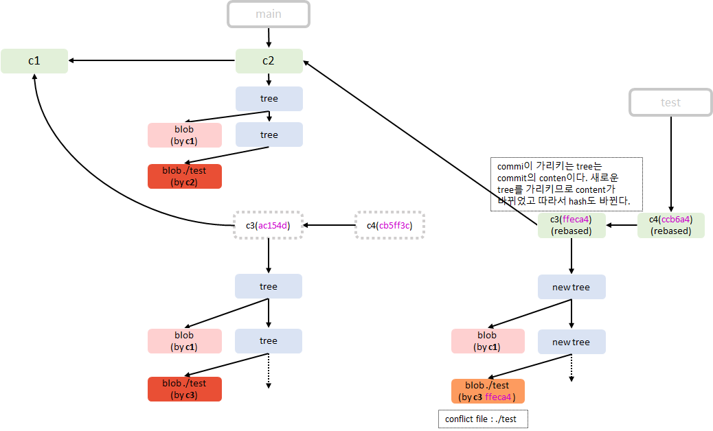 아래 그림을 봐보자. rebase를 하면 기존에 존재하던 커밋들(예를들어 c3, c4)의 commit author, commit title등등은 같지만 사실 commit hash가 이전과 다르다. rebase를 하기전에는 부모 관계가 c1 <- c3 이였지만 이후에는 c2 <- c3 이다. 기존의 c3 커밋은 c1 커밋과 특정 tree, blob을 공유했지만 이제는 c1, c2 커밋들의 tree, blob을 공유하게 된다. rebase를 하기 전의 c3 커밋이 가리키던 Root Tree와 Parent 커밋이 rebase의 이후의 c3커밋이 가리키는 것과 다르므로 당연히 커밋의 hash도 다르다.