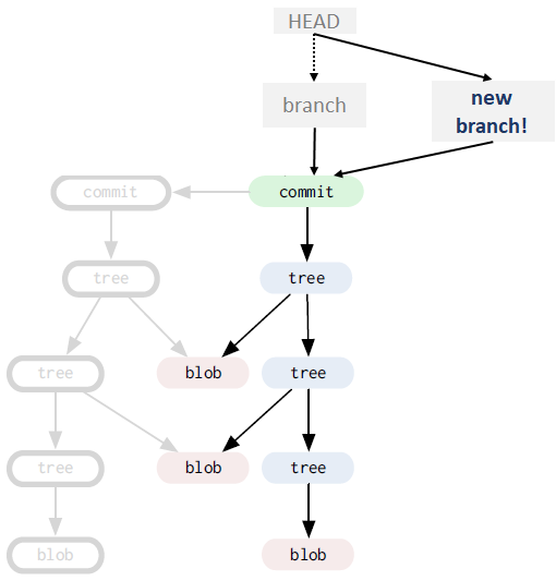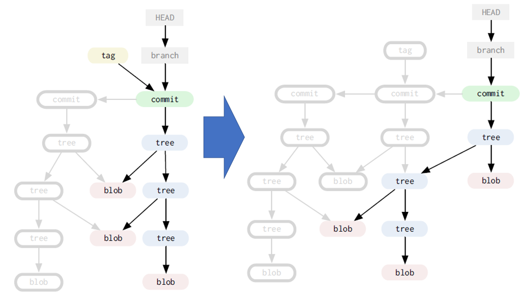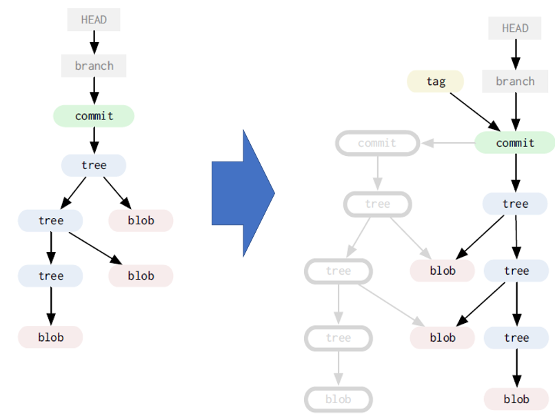 지금부터 아래와 같은 그래프들을 예로들어 설명한다. 회색 박스는 mutable 참조 ( 변경 가능한 참조 ) , 나머지들은 immutable 참조들이다. 즉 HEAD, remove, branch들은 각각 그 참조값을 변경 가능하지만 tag, commit tree 등등에 존재하는 참조값은 변경 불가능하다.