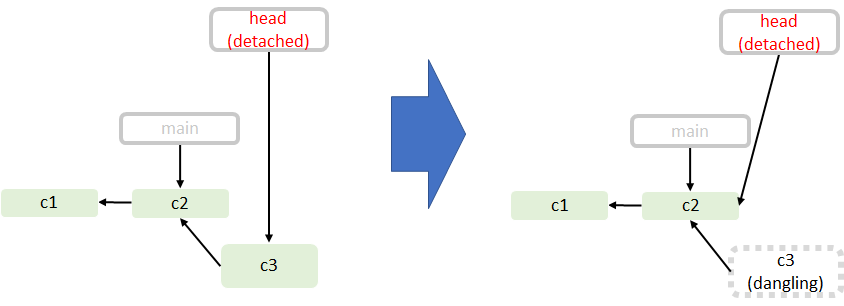 아래 그림을 봐보자. 처음 head가 main branch를 가리키는 상태에서 c2로 checkout을 하면 detached된 상태이다. 이 상태에서 c3 커밋을 하나 만들면 detached head가 c3을 가리킨다.