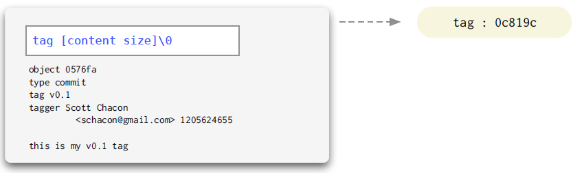 Tag에는 tag가 가리키는 object, 그 object의 type, 그리고 아래 “v0.1” 과 같은 tag 이름 , tagger , tag message가 content로 저장된다.