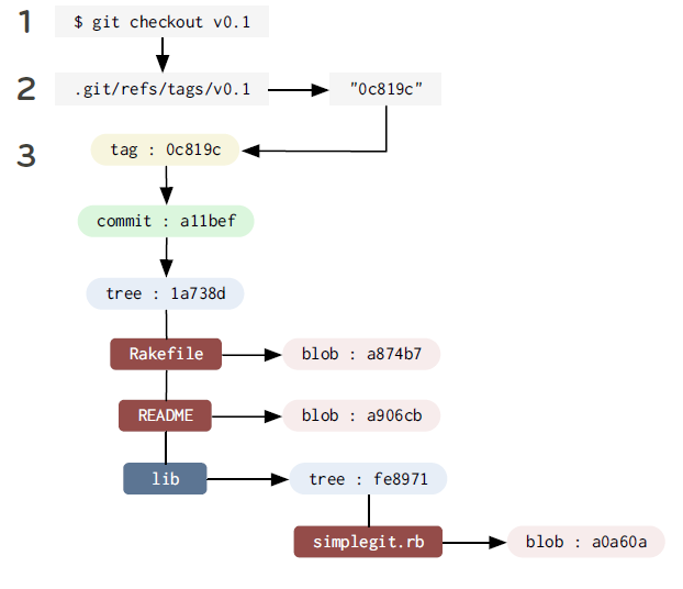 만약 우리가 git checkout v0.1 이라는 명령어를 치면 git은 v0.1 tag를 찾고, 해당 tag가 가리키는 commit을 찾는다. 이후 Root Tree부터 차근 차근 Tree에 저장된 리스트를 훑어 보면서 파일 모드, 권한을 재구성하고 디렉터리를 재구성한다.