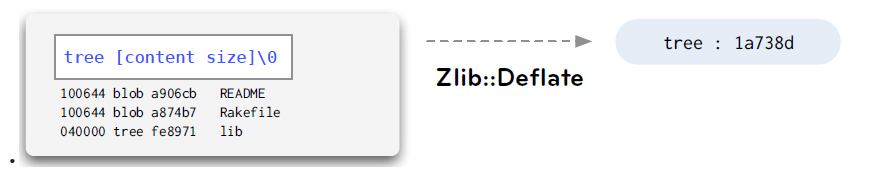 git object들은.git 디렉토리에 zlib으로 compressed 되어 저장된다. 그리고 그 Object의 이름은 [compress 되기 전의 content데이터+헤더값]의 sha-1 hash가 object의 이름이 된다. 헤더값은 [종류]\x20[decimal ascii size]\x00 포맷이다. 즉 Objec가 blob 타입이고 사이즈가 6이라면 “blob\x206\x00” 이 헤더이다.