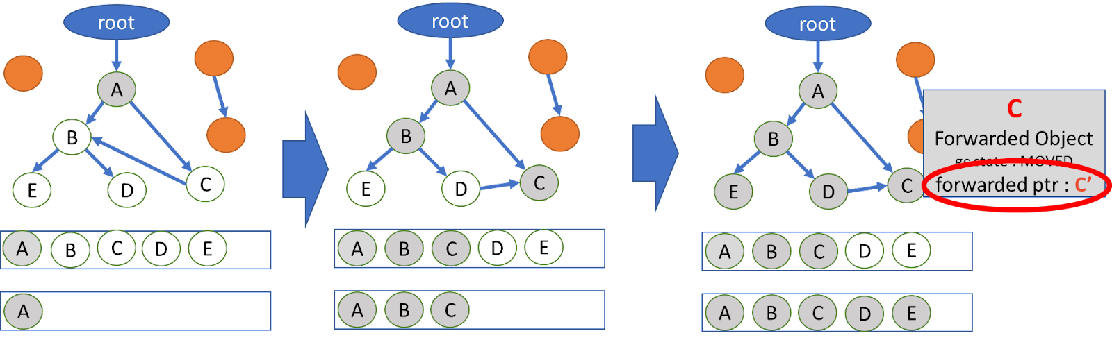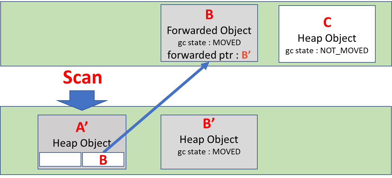 1. 루트에서 direct로 reachable한 object들(root object들)의 gc-state를 MOVED로 표시 후 to space로 복사하고, 복사한 주사로 field를 update한다. 그리고 from space에 남겨진 object는(위 그림에서 B) ForwardedObject로 casting 한 이후 forwardPtr을 set한다. to-space로 이동한 객체는 worklist에 넣는다.