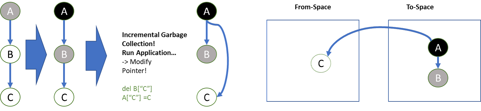 이 상태에서 Application이 실행 되어 B->C 로의 참조가 삭제되고 A->C 로의 참조가 추가되었다. 이런 상태면 C는 tracing 되지 못하고 from-space에 덩그러니 남아있게 된다.