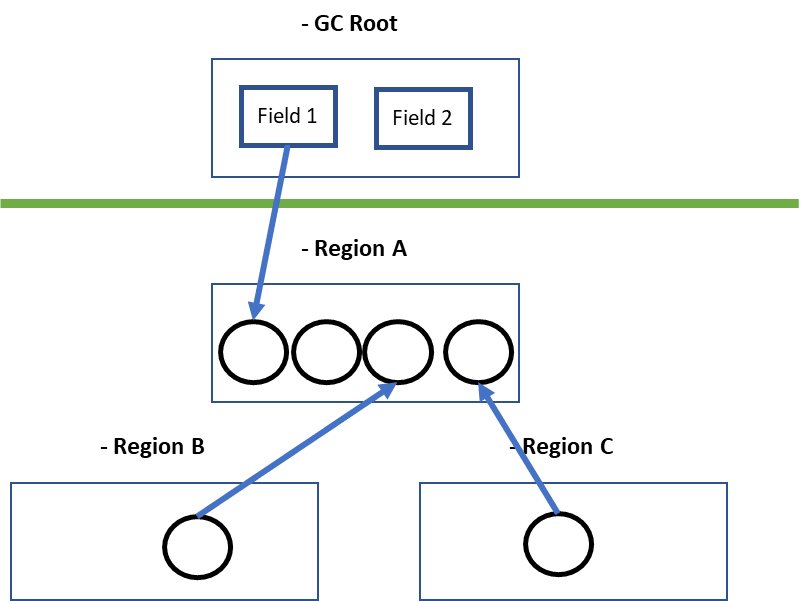 아래와 같이 여러 Region이 존재하는 환경을 고려해 보자. 이 Region들은 모두 따로 Garbage Collection을 수행한다. 따라서 모든 다른 Region 끼리의 참조는 Region 각각의 Garbage Collector에서 모두 해결해줘야 한다. 예를들어 Region A의 GC가 동작할 때 Region B-> Region A, Region C -> Region A 참조 들을 모두 갱신해줘야 한다.