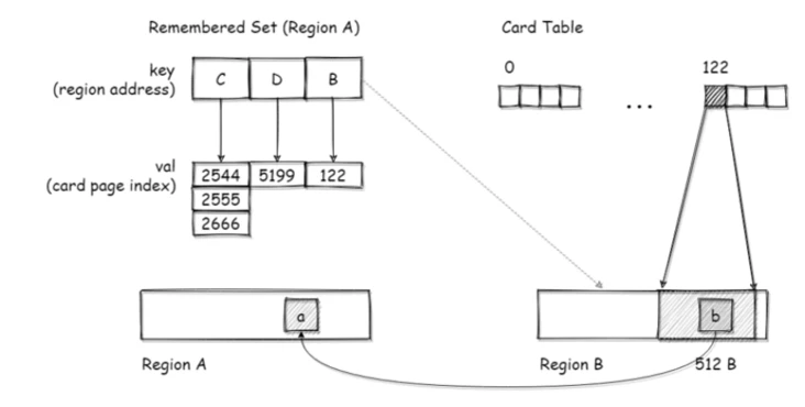 이런 환경에서는 Remembered Set이 Object의 주소나 Object Field주소를 저장하는게 아니라 각 Region의 Card Table의 인덱스를 저장한다. Remembered Set은 Map형태로 존재하게 되는데 Region이 Key이고 Map의 Value는 해당 Region의 Card Table 인덱스들의 Set이다. 예를들어 아래 그림에서 Region A의 Remembered Map은 Region B 를 Key로 넣으면 Region B의 Card Table을 위한 Index들의 Set이 존재한다.