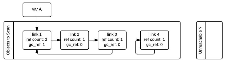3. Traversing이 끝나면 기존 object list를 돌면서 gc_ref 값을 ref count값으로 복구시켜준다. sweep list에 있는 object들은 모두 free시켜버린다.