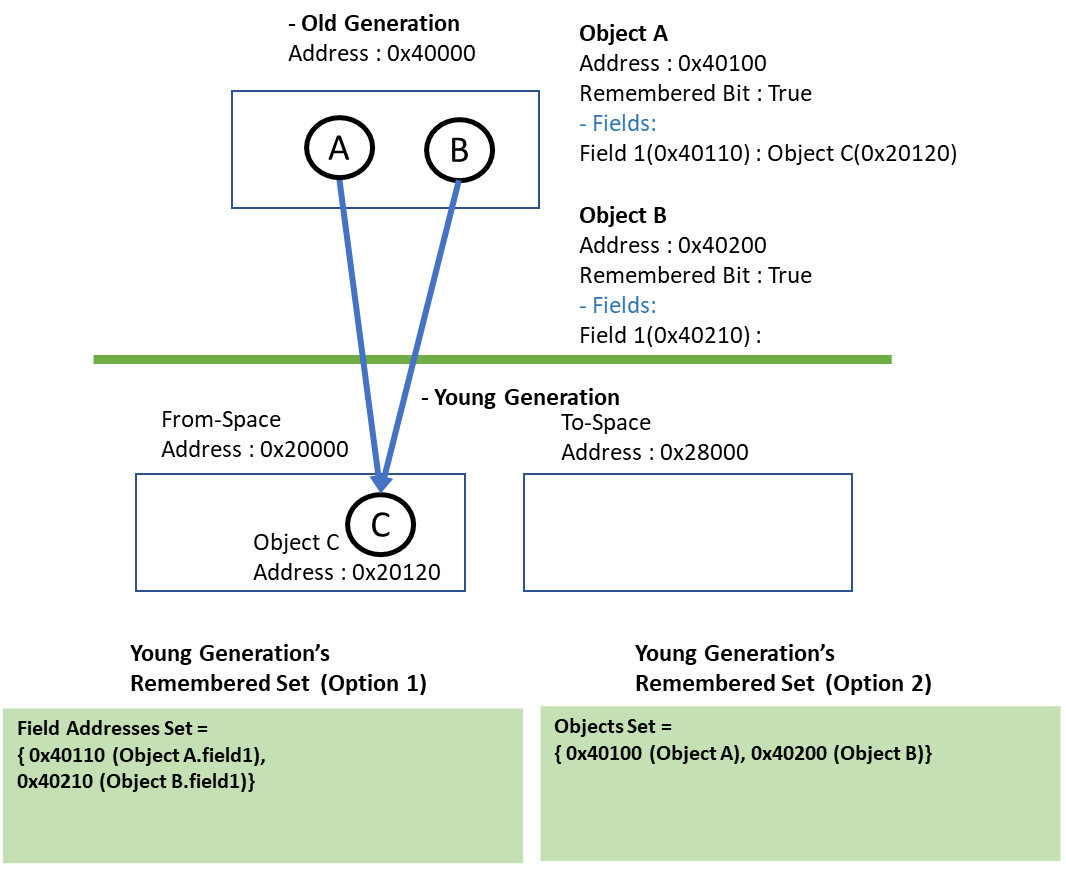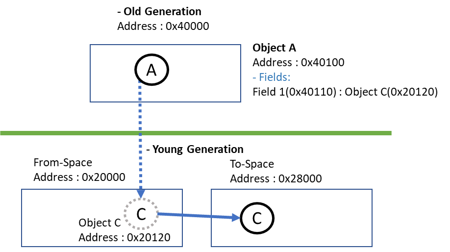 Young Generation만 Garbage Collecting하면 Old-Generation에 있는 Object가 Young-Generation에 있는 Object를 가리킬때 Pointer가 갱신되지 않는 문제가 발생한다. 같은 Young-To-Young Reference는 Minor GC가 Reachable한 Object를 Grey에서 Black으로 바꾸면서 모두 갱신해주기 때문에 신경쓸 필요 없다. 하지만 Old-Generation에 있는 Reference는 Minor GC가 Scan자체를 하지 않으므로 갱신해줄 수 없다. (*Stack Variable은 항상 GC Root 취급이므로 신경쓸 필요 없다. Minor GC이든 Major GC이든 GC Root들은 최우선 Scan대상이다. 따라서 오직 Old-To-Young Reference 만 다루면 된다. )