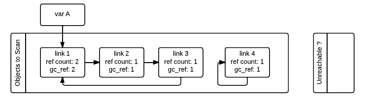 CPython에서는 모든 object에 ref count field가 사실 2개가 존재한다. 하나는 원래 존재하는 ref count field이고 다른 하나는 garbage collecting시 count를 감소시키기 위한 field이다.