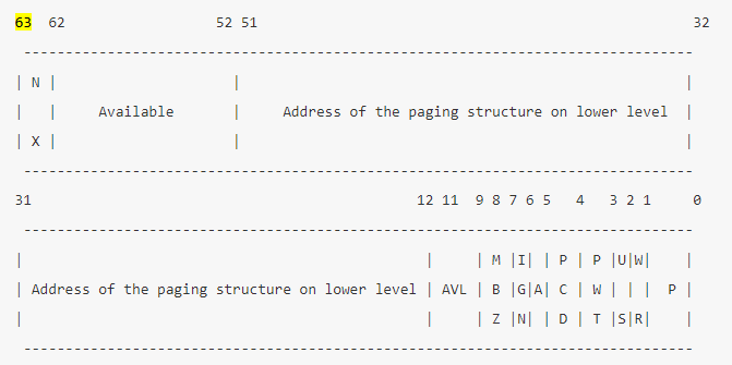 PML4 엔트리의 구조는 다음과 같다. PML4 Entry의 [51:12] 비트는 다음 레벨( PDPT ) 테이블의 물리 주소를 가리킨다. 같은방식으로 반복해서 마지막 PTE까지 찾아내면 PTE는 페이지의 주소를 가리키고 access 하려는 Virtual Address의 [11:0] 비트가 페이지의 오프셋으로 쓰인다.