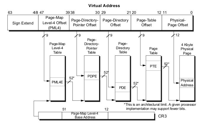 x64라도 access 하려는 virtual address의 [63:48] 비트는 쓰이지 않는다. CR3 레지스터는 PM L4 (PageMap Level4) 물리 주소를 가리키고 access 하려는 virtual address의 [47:39] 비트는 PM L4에 Offset값으로 쓰인다.