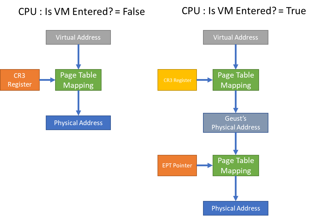 MMU를 이용해 Mapping을 할때 지금 Guest인 상태( 지금 vmenter 한 상태라면)라면 CPU & MMU가 자동으로 2단 맵핑을 진행한다.