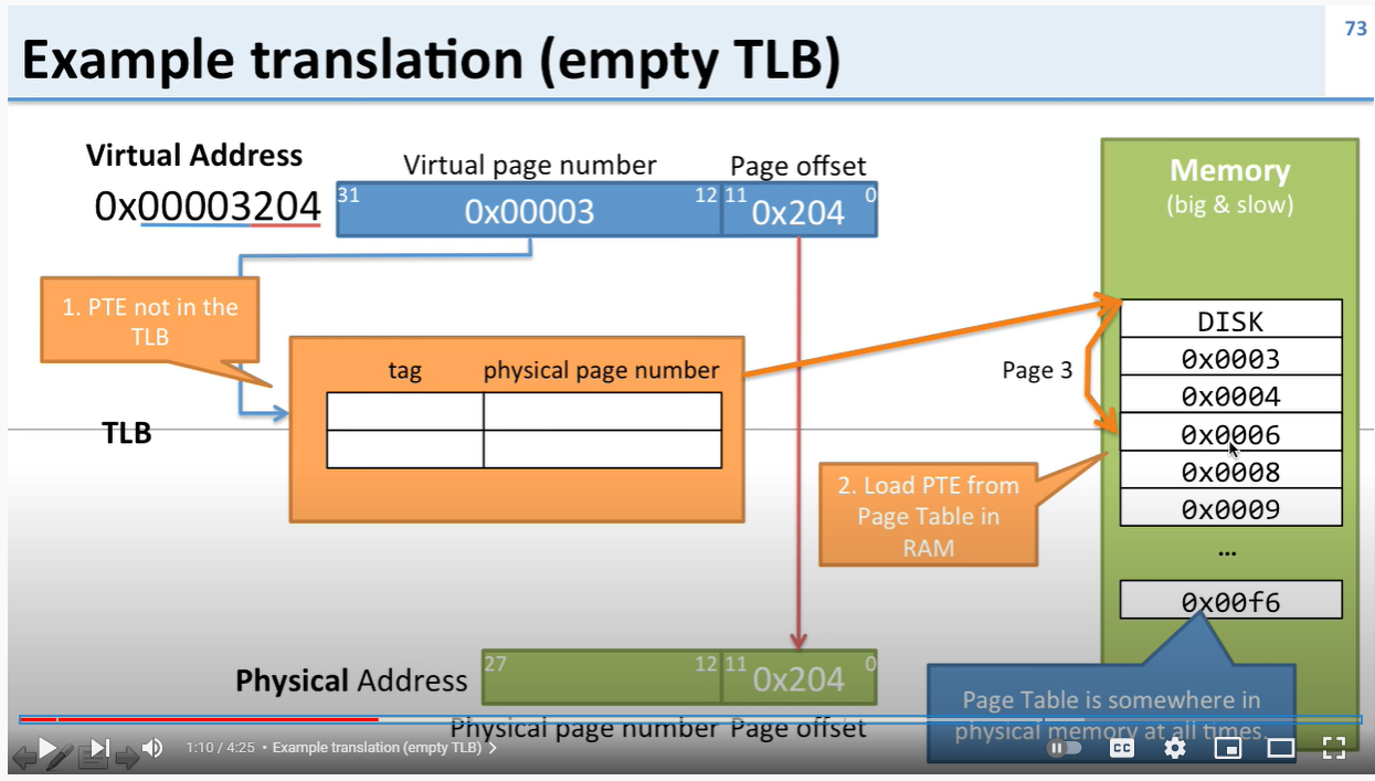 Virtual Page Address Prefix를 Physical Page Address Prefix로 맵핑해주는 맵핑 버퍼다. CPU에서 자동으로 처리되는 VADDR 0x00003204로 접근한다고 하자. TLB에 0x00003 이라는 Tag값이 없다. 결국 Page Direction -> Page Table 을 거쳐 물리주소를 알아내야 한다.