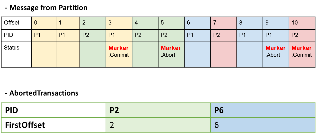 아래 그림에서 처럼 Consumer가 Message를 받았을 경우를 생각해 보자. AbortedTransaction은 Aborted된 Transaction들이 FirstOffset 순서대로 정렬되어 저장되어 있다. 따라서 Consumer는 메시지를 읽다가 AbortedTransaction의 PID=P2, FirstOffset=2 데이터를 확인하고 PID=P2인 메시지는 Abort Marker를 만날때 까지 모두 Drop한다.