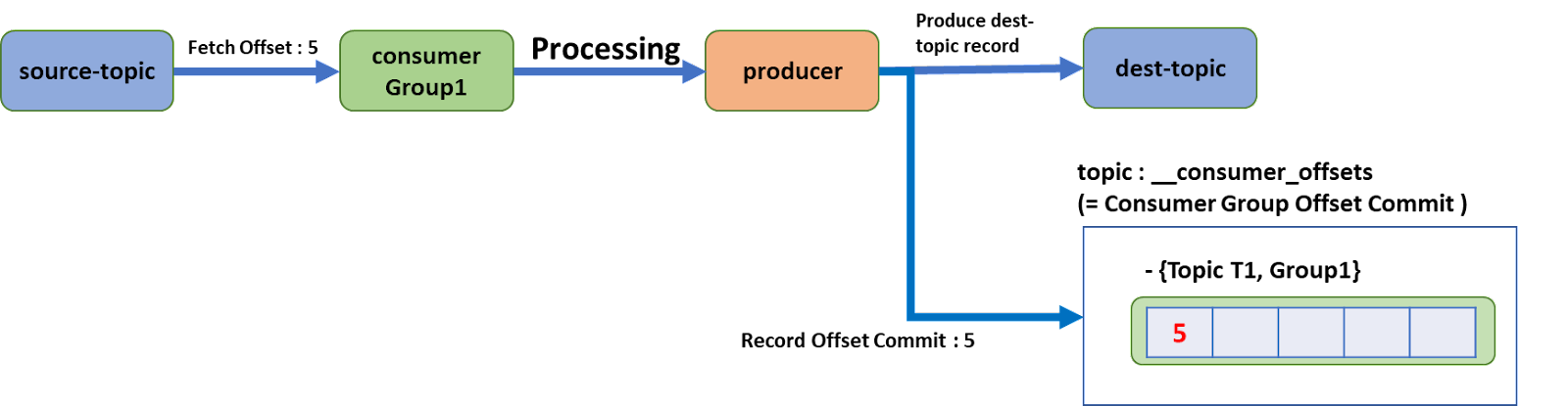 이때 consumer가 offset commit을 기록하는게 아니라 이후에 Producer가 Atomic하게 Dest-Topic에 Produce를 하는 동시에 Consumer offset commit을 기록하게 하면 “consume - process - produce” 과정에서 exactly-once가 지켜진다. 이때 consumer의 offset commit을 기록하는 Topic을 __consumer_offsets 라 한다.
