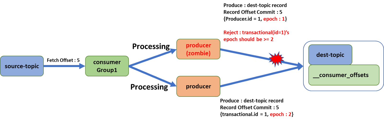 Producer ID는 producer.initTransactions() 함수 실행시 부여받는데, 이때 epoch값 역시 생성된다. epoch값은 이전에 생성된 zombie Producer를 구분하기 위한 값으로 initTransactions을 호출할 때 마다 증가한다. 따라서 가장 최근에 생성된 Producer가 producer.initTransactions를 호출할 때 epoch값을 증가시키고, 이때 Zombie Producer가 가진 old한 epoch값은 Producing을 할 때 Reject를 당한다.