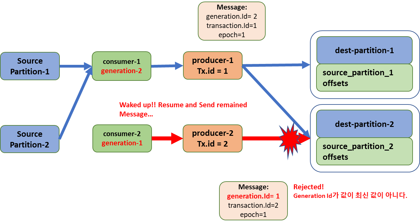 - 2. 그러다 갑자기 consumer-2가 깨어났다. 이때 아직 Processing 중이던 메시지가 있었는데 Producer-2 마저 전송했다. 하지만 Kafka는 Transaction.id가 같아야만 Zombie fencing을 한다. 따라서 producer-2는 Write에 성공하고 EOS가 침해된다.