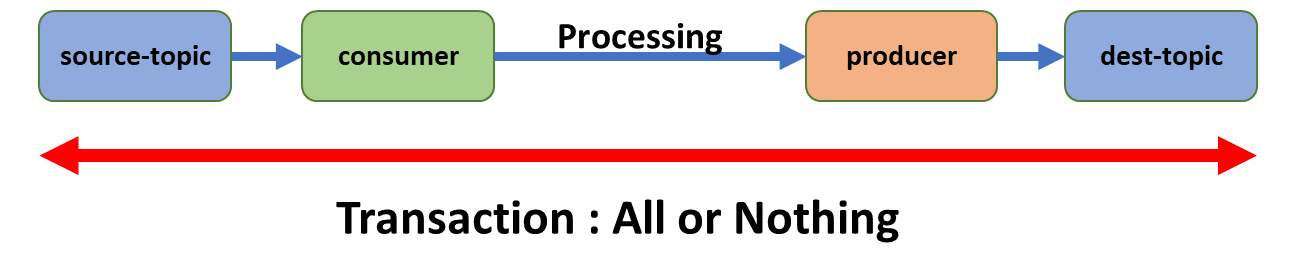 Kafka의 Transaction은 source topic으로 부터 “consume - process - produce” 작업을 한 후 dest-topic에 저장할 때 Duplication 없이 dest-topic에 한번만 저장하는 것을 보장한다. ( *중간에 Processing 과정은 여러번 수행될 수 있다! 최종적으로 dest-topic에 저장되는 것이 중복/누락 없도록 보장하는 거다. )