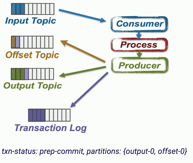2. Producer가 해당 메시지를 이용해 “새로운 메시지를 생성하고 Consumer의 offset commit을 update하는 작업을” Atomic하게 수행한다. 이를 atomicProduceAndUpdateOffsetCommit함수라 하자. ( 이따 살펴볼 Atomic Multi Partition Writes를 이용해 Atomic하게 두 작업을 수행할 수 있다. )