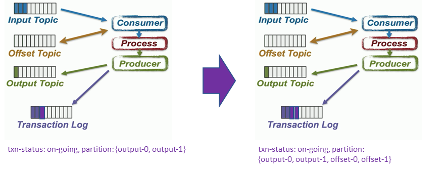 단지 consumer의 offset topic에 메시지를 추가한다는 것 말고는 produce()와 동일하다. offset-topic 역시 이번 Transaction에 연루되므로 Transaction-Log에 연루된 파티션으로 추가된다.