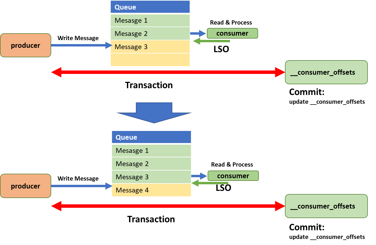 카프카가 Transactional Producer가 마지막으로 Produce한 메시지가 commit되면 LSO(Last Stable Offset)이 해당 메시지를 가리킨다. 만약 Transactional Producer가 Produce한 메시지가 아직 commit되지 않았다면 LSO offset은 아직 이전 Message를 가리키는 상태이다. Rollback시엔 LSO 이후에 쌓인 메시지를 모두 폐기한다.