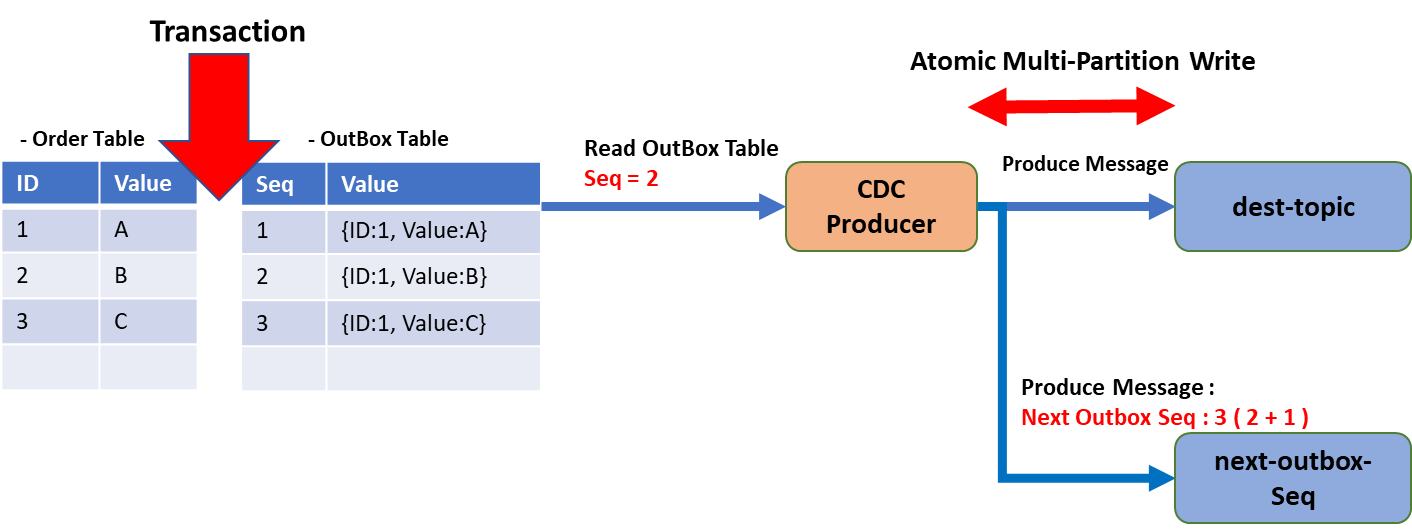 OutBox테이블에는 Sequence 값과 함께 메시지를 저장한다. CDC Producer는 next-outbox-seq Topic으로부터 Seq값을 가져온 Seq에 해당하는 메시지를 DB로 부터 읽어 와 Atomic Multi Partition Write로 “dest-topic에 쓰는 동시에 next-outbox-seq의 Seq값을 +1로 Update” 연산을 수행한다.