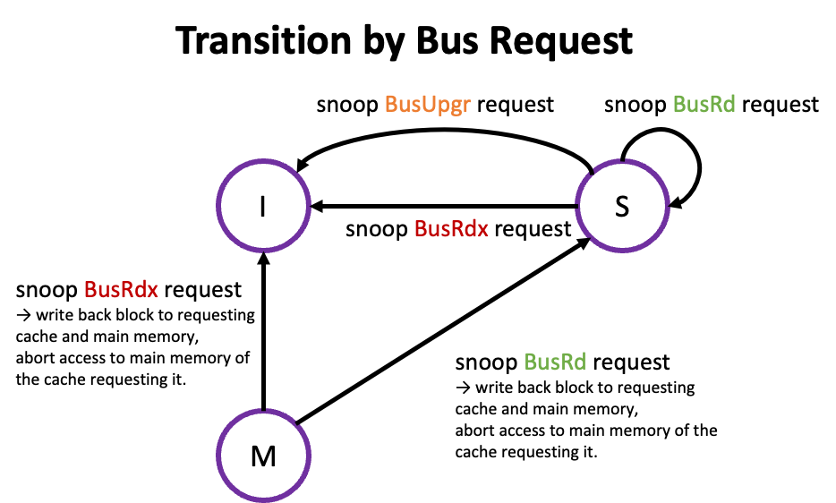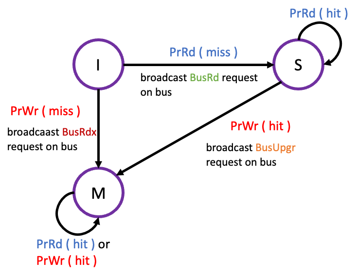 MSI protocol에서는 block은 다음과 같은 3가지 상태로 존재한다. block의 상태에는 위에서 본 2가지 요인( CPU Operation, Bus Request) 에 의한 Transition 발생할 수 있다.