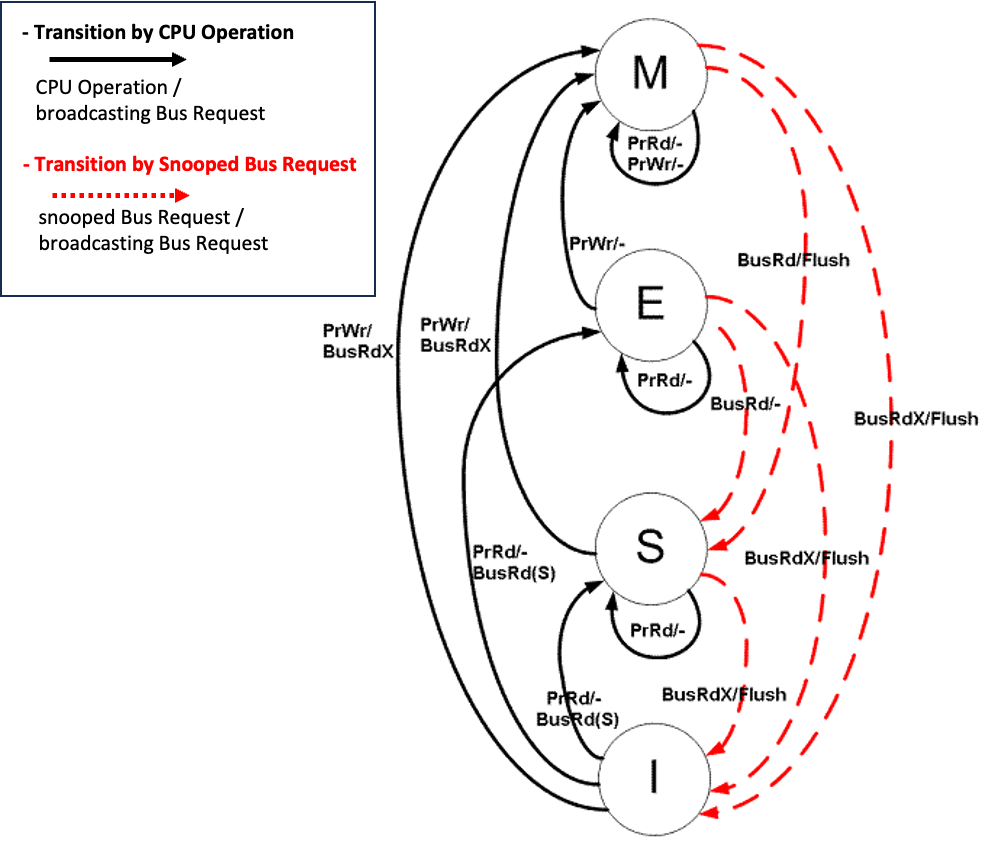 MESI Protocol의 transition을 CPU Operation 에 따른 transition(아래 그림에서 왼쪽 편)과 Bus Request snooping에 의한 transition(아래 그림에서 오른쪽 편)으로 나타내면 아래 그림과 같다.