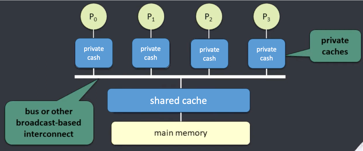 모든 프로세서가 전역 버스를 통해 공유된 메인 메모리에 접근하는 구조이다. 메인 메모리 중간에는 L1, L2 와 같은 private cash와 L3와 같은 shared cache가 있을 수 있다.