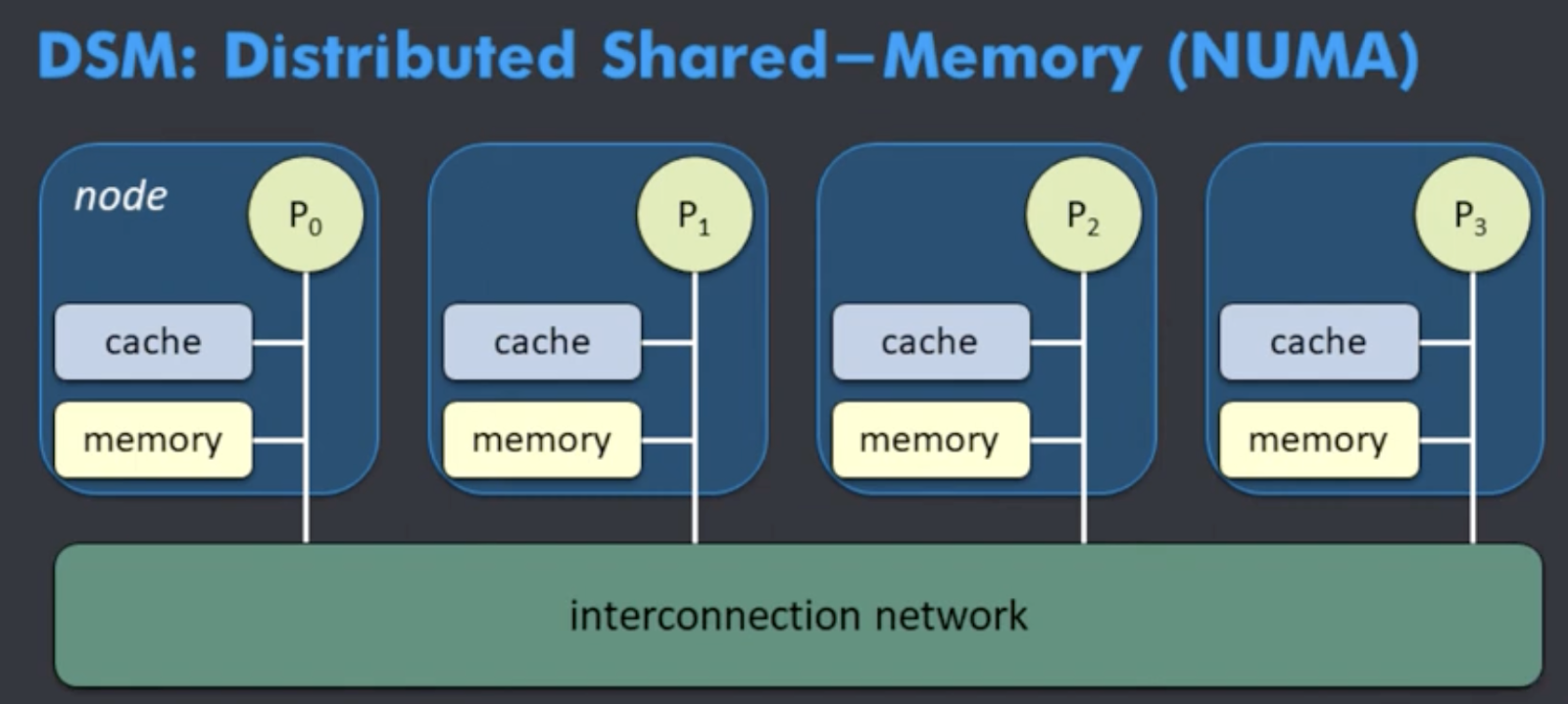 각 프로세서마다 자신의 local memory를 가지며, 따라서 다른 프로세서의 메모리에는 더 느린 버스(혹은 네트워크)를 통해 연결되어 있어 시⬝공간적으로 더 멀리 떨어진 구조이다. 각 메모리마다 access 시간이 불균등하기에 NUMA ( Non-Uniform Memory Access time ) 아키텍처라고 할 수 있다.
