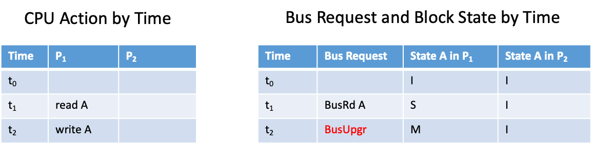MSI Protocol의 문제는 쓸데없는 BusUpgr request가 발생할 수 있다는 점이다. 예를들어 아래 왼쪽처럼 프로세서 P1이 변수 A를 read한 후 write를 했을 때, 블록을 copy를 가진 ( 즉 shared 상태인 ) 캐시가 없음에도 BusUpgr request를 broadcast 하게 된다.