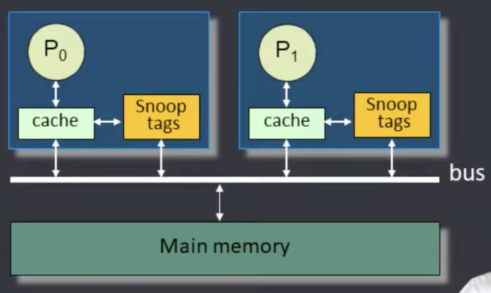각 코어의 cache controller가 write와 같은 event를 버스를 통해 broadcasting하고, 다른 cache controller는 bus를 계속 snooping하다 event를 읽고 대응하는 방식이다. 이때 event에는 어떤 메모리 주소에 해당하는 block인지를 나타내는 정보가 담겨있어야 한다.